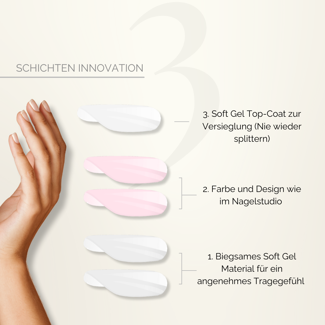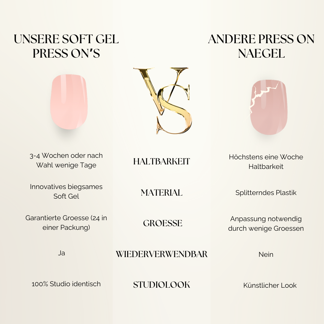 3-4 Wochen Haltbarkeit wie im Studio: Der absolute Game-Changer unter den Press On Nägeln. Unsere Soft Gel Press Ons sind beigsam und passen sich deinem Naturnagel an: Bye bye splittern, hallo Studiohalt!