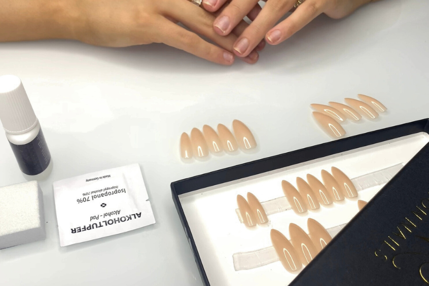 Streiche deinen Naturnagel komplett mit Kleber ein, nachdem er entfettet wurde und gehe anschließend erneut in den Kleber und streiche den Teil des Fake-Nagels ein, der deinen Naturnagel bedeckt - nicht am Kleber sparen! Drücke den Fake-Nagel für 30 Sekunden fest auf deinen Naturnagel - Je länger du ihn festdrückst, desto besser hält der Fingernagel.